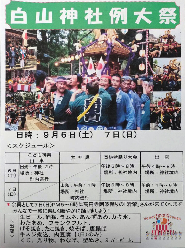 両日18時〜の奉納盆踊りのお囃子として参加致します。